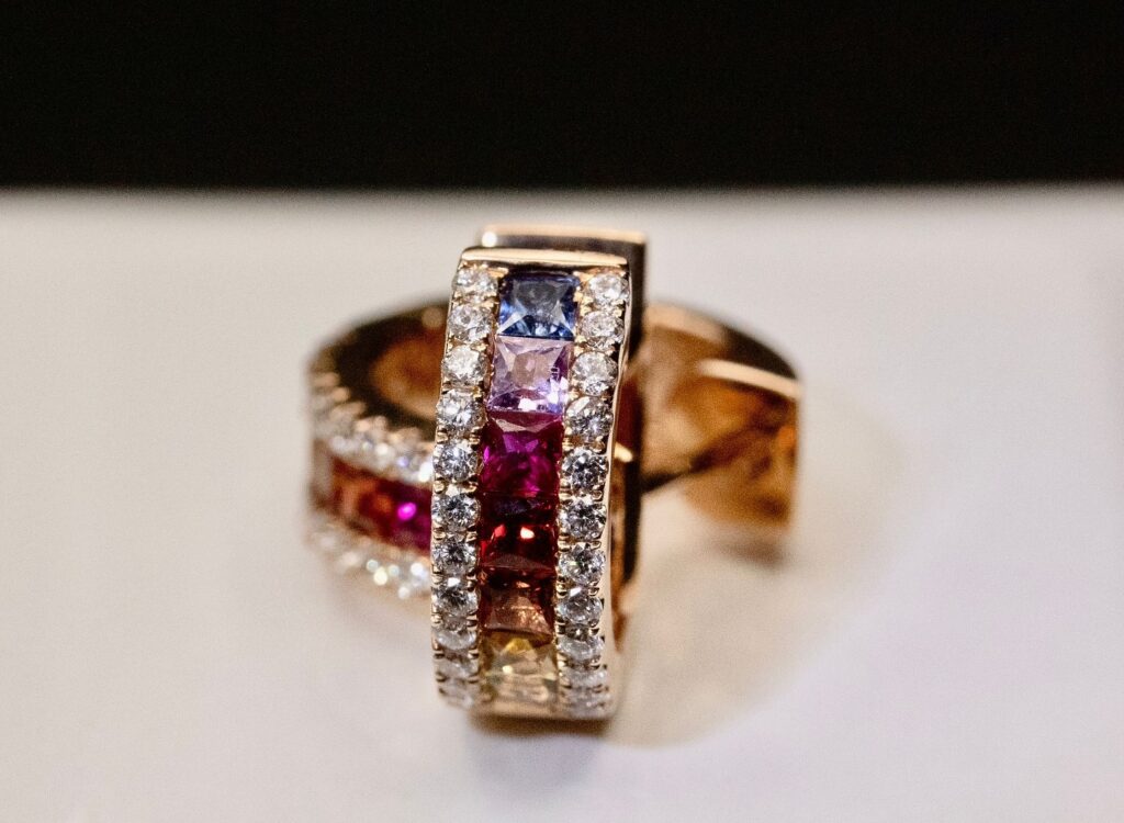 Leuchtende Steine, von Diamanten gekrönt – ein Ring, der Freude und Exklusivität vereint.