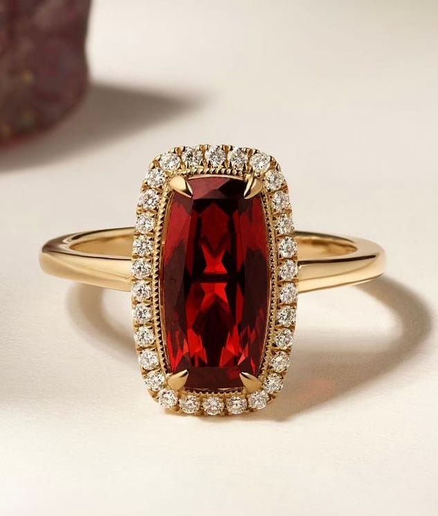 Rhodolith-Granat in 14kt Gelbgold, von Brillanten umrahmt – geschaffen für alle, die nicht übersehen werden wollen.